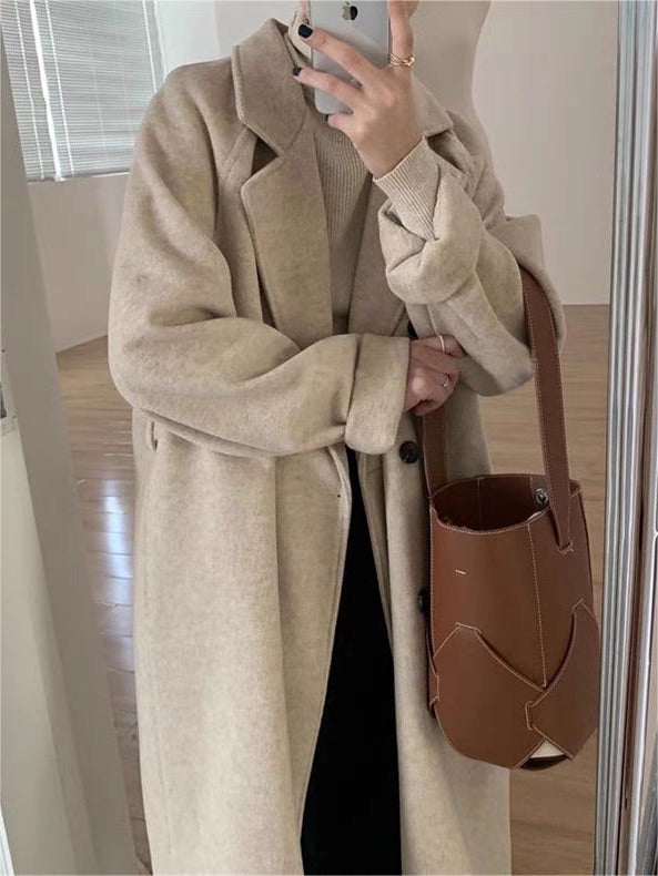 This belted long coat for women blends structured tailoring with a relaxed, oversized fit to deliver an easy, polished layer for autumn and winter. Classic notched lapels and tonal buttons create clean lines that move effortlessly from office hours to evening plans. An adjustable belt and smooth drape make layering simple while keeping a refined silhouette.