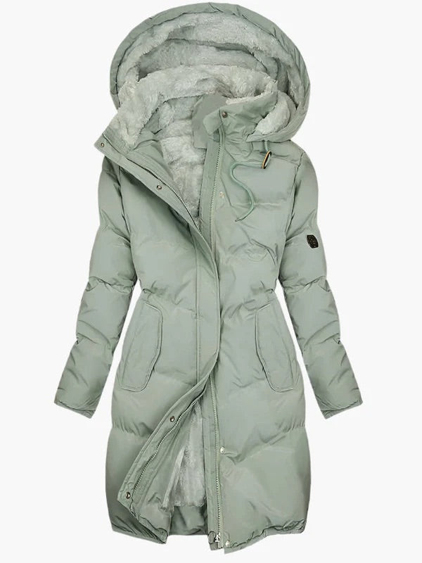 This women's long quilted hooded jacket blends full-length coverage with a flattering, tailored silhouette to keep you comfortable throughout the cold season. Plush lining and a roomy hood provide reliable insulation so you can move confidently on winter commutes or weekend errands. Thoughtful closures and easy-access pockets make it a practical insulated jacket that performs as well as it looks.